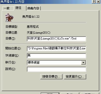 目標那欄 後面打 "空格"/korean 如圖 "C:\Program Files\GAMANIA\天堂(Lineage 220C)\LiTo.exe" /korean 註:由於韓國的無界TEST伺服器已經關閉 所以必須連到KOREAN更新
